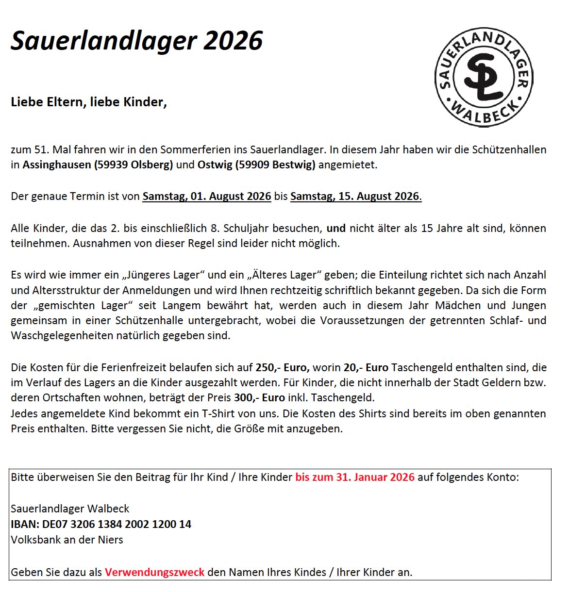Zum 51. Mal fahren wir in den Sommerferien ins Sauerlandlager. In diesem Jahr haben wir die Schützenhallen in Assinghausen (59939 Olsberg) und Ostwig (59909 Bestwig) angemietet. Der genaue Termin ist von Samstag, 01. August 2026 bis Samstag, 15. August 2026.